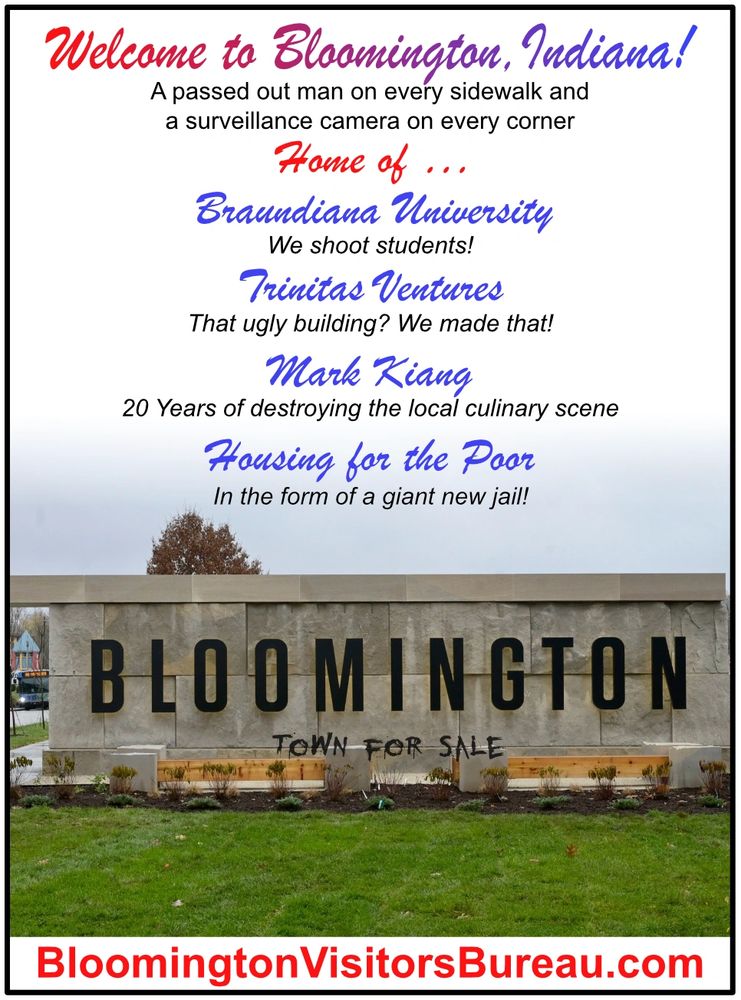 We used to be a "Tree City"! We were able to shed the burden of qualifying as a Tree City USA town by simply tearing down trees to build more prefab apartment buildings and parking garages. Trees are a scam. They don’t pay taxes. And they are hard to monetize without cutting them down. That is why Bloomington Indiana is proud to be free of the blight of excess trees and the "nature" that comes with them.